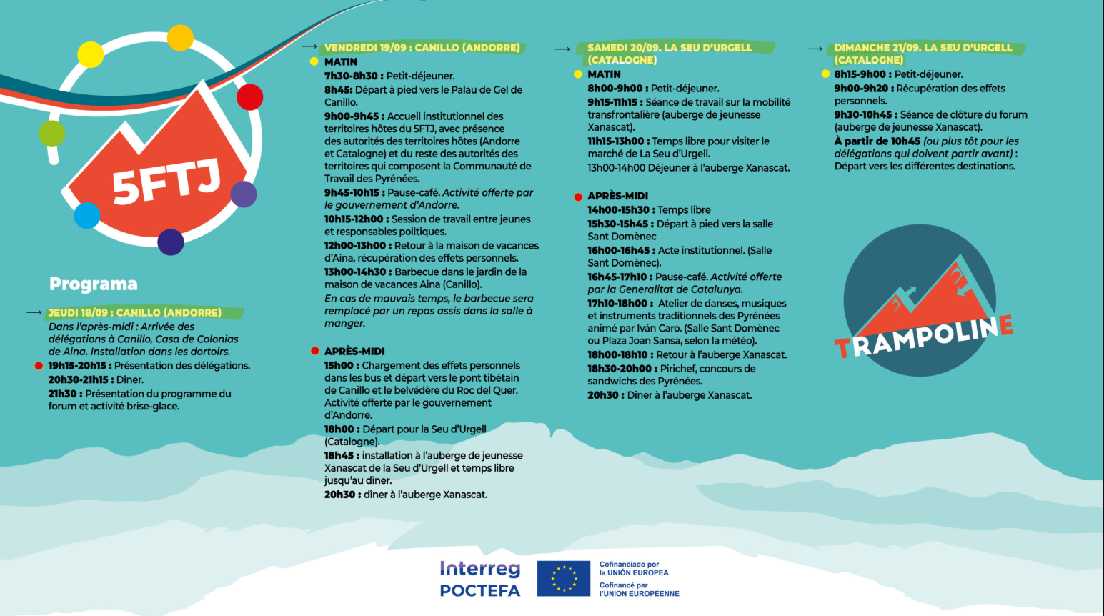 Du 18 au 21 septembre 2025, le Vᵉ Forum transpyrénéen de la jeunesse se tiendra entre Andorre et la Catalogne, réunissant soixante jeunes issus des sept territoires de la Communauté de Travail des Pyrénées (Nouvelle-Aquitaine, Occitanie, Aragon, Catalogne, Pays basque, Navarre et Andorre).